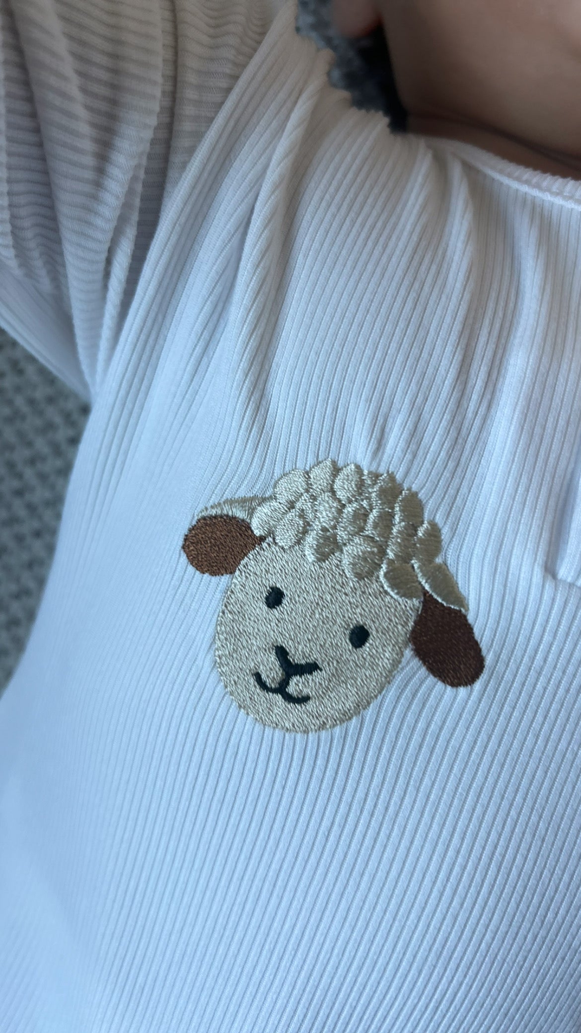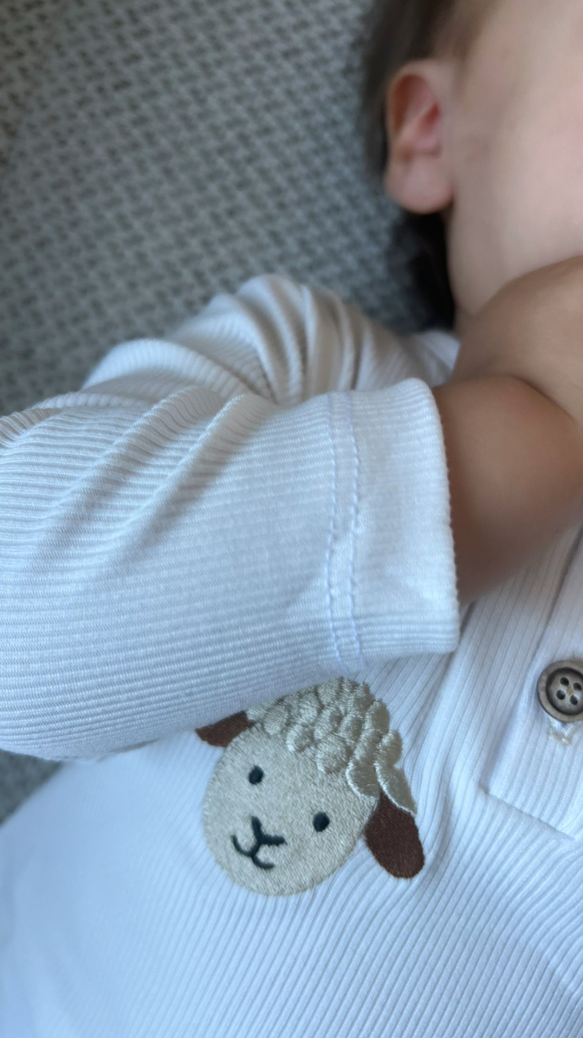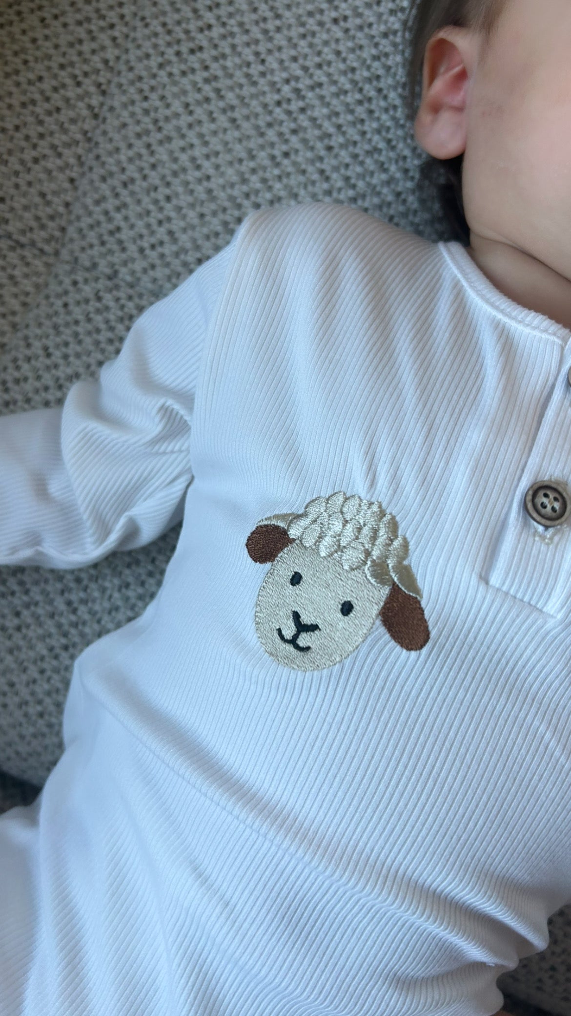 Sweet sheep embroidery with decorative buttons. Soft, stretchy, and extra comfy.