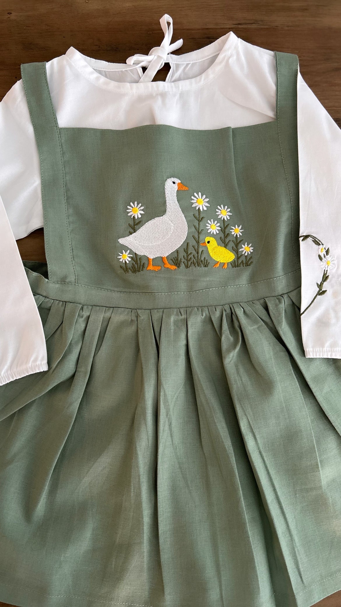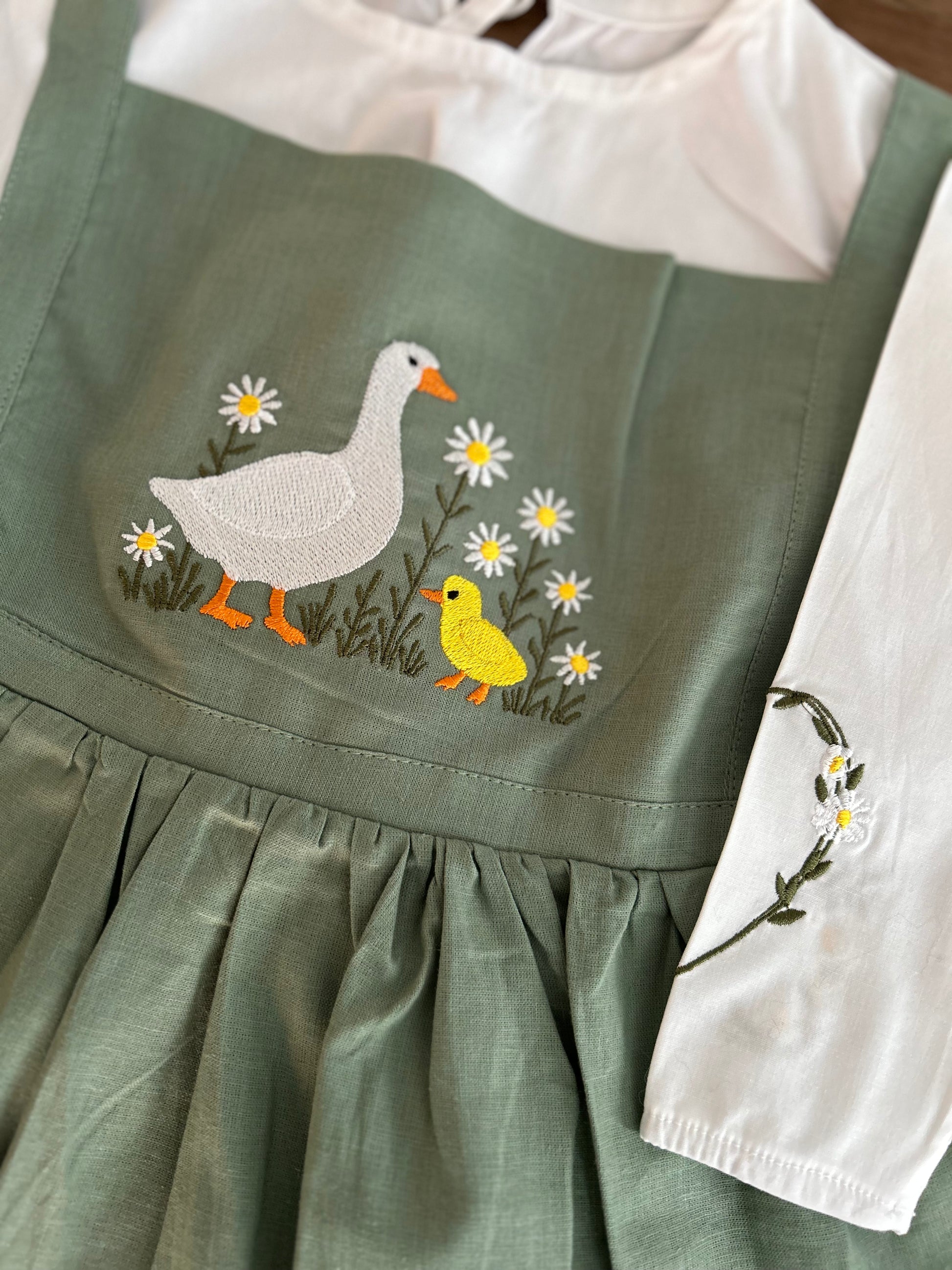 Charming overall-style dress with duck embroidery, paired with a delicate embroidered shirt. Soft, breathable fabrics for all-day comfort.