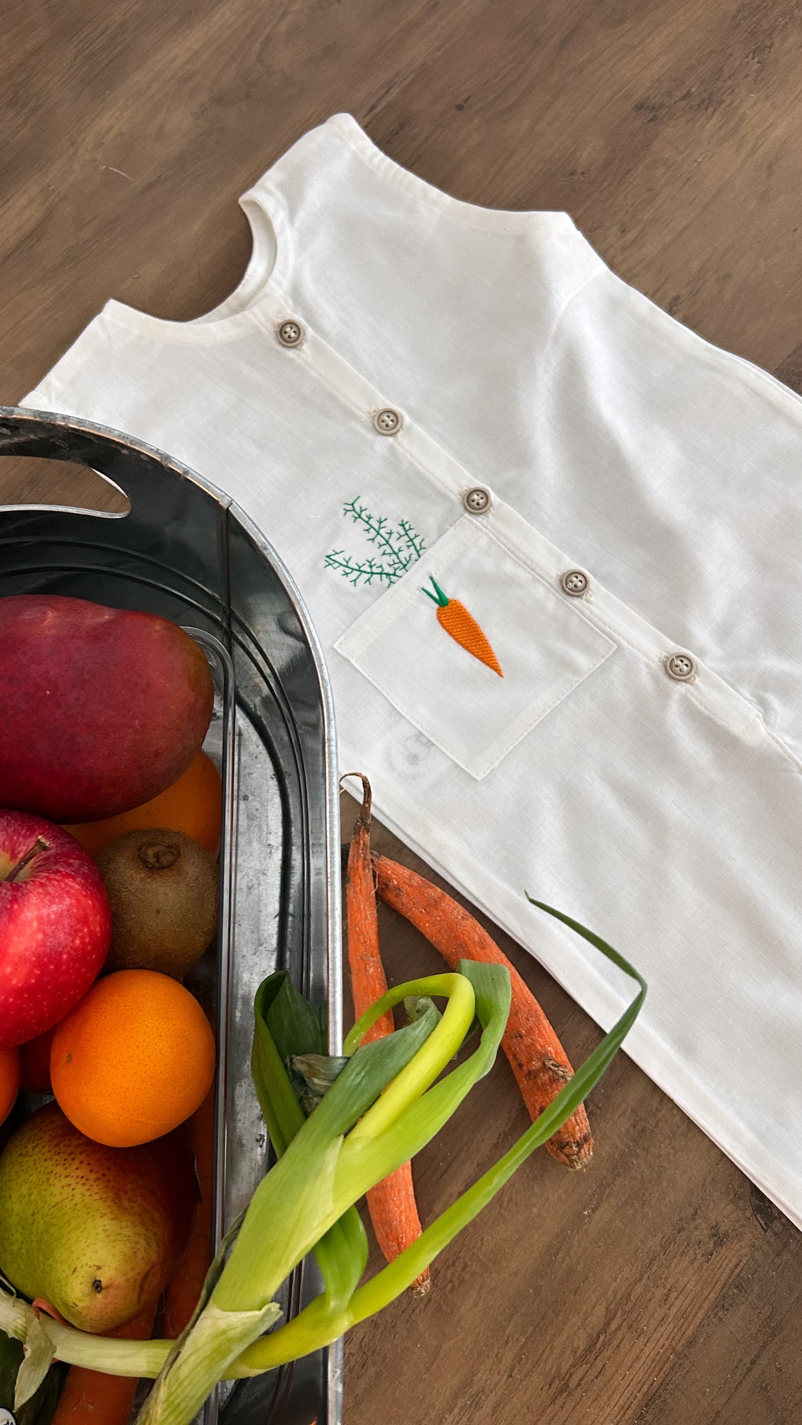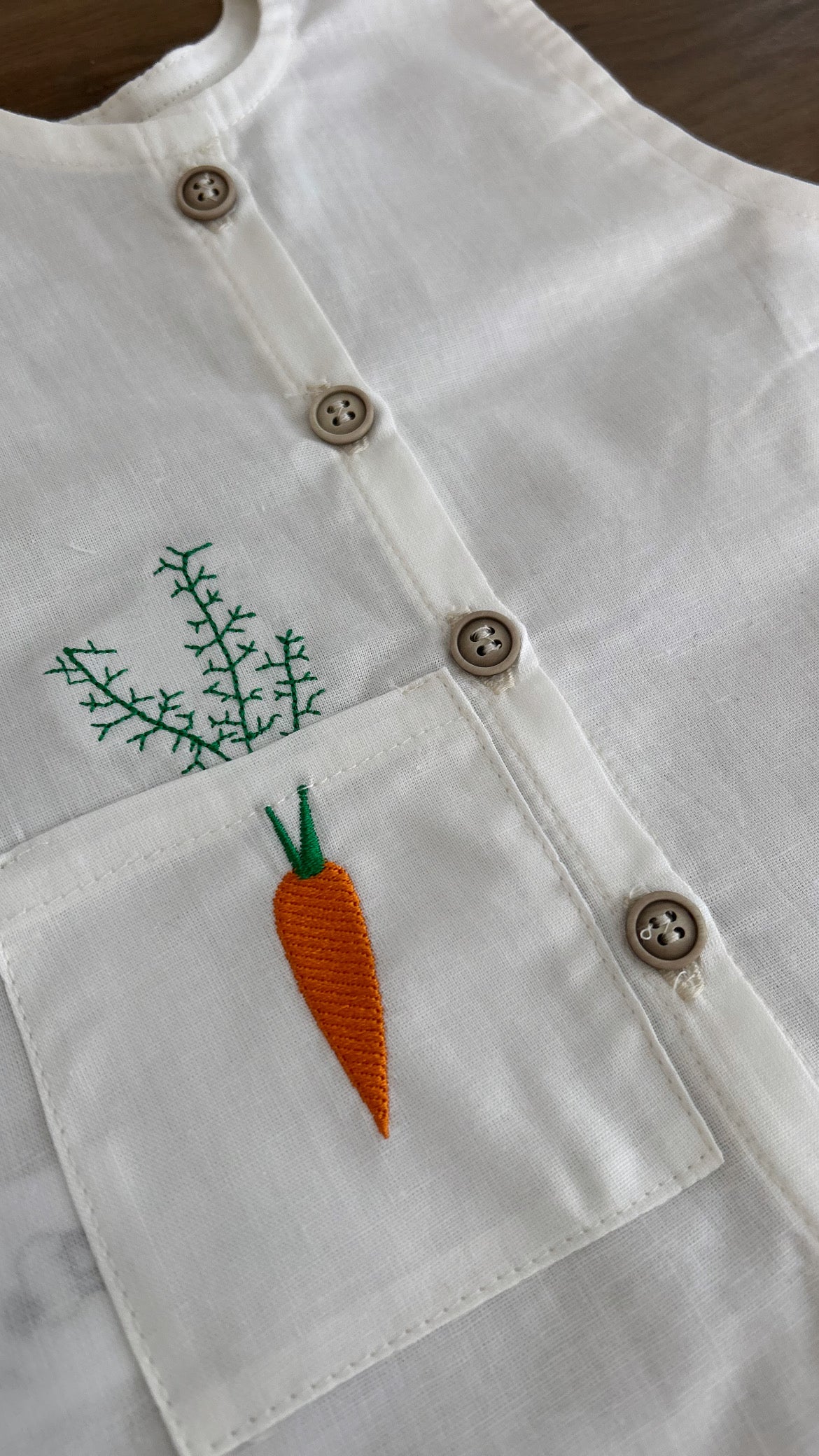Playful carrot embroidery on pocket, stretchy and comfy for all-day adventures. Soft and durable.